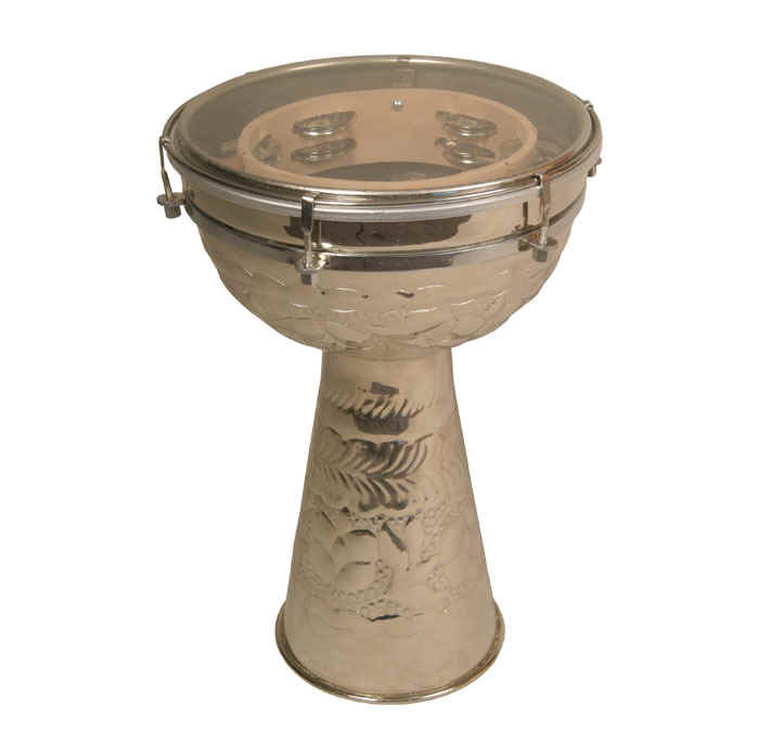 Description: Doumbeks with Jingles are commonly used with belly dancers. The jingles are mounted inside the rim and the Doumbek shell is engraved with floral patterns. The tunable head makes for easy adjustment of tones.Head Size: 12"